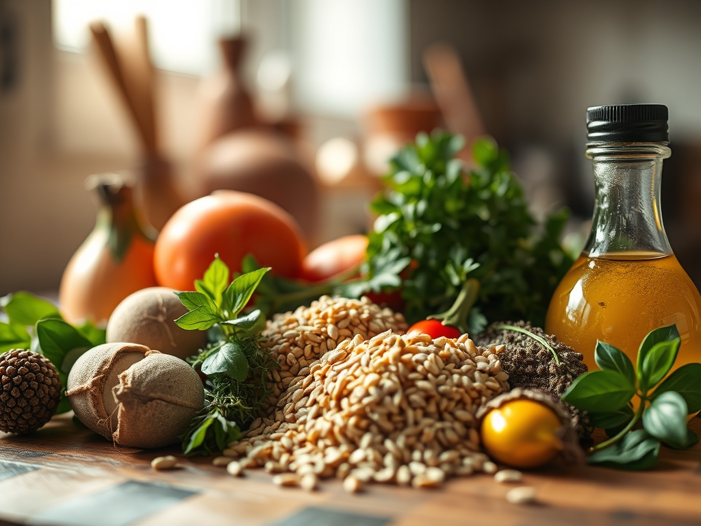 Os agentes aromáticos são cruciais. Vais precisar de uma cabeça de alho generosa, coentros frescos com talo (onde reside a maior concentração de óleos essenciais), poejos, louro, vinagre de vinho branco de boa acidez e um azeite virgem extra com notas herbáceas. A farinha de trigo serve como o teu agente espessante, criando uma suspensão que liga a água ao azeite.